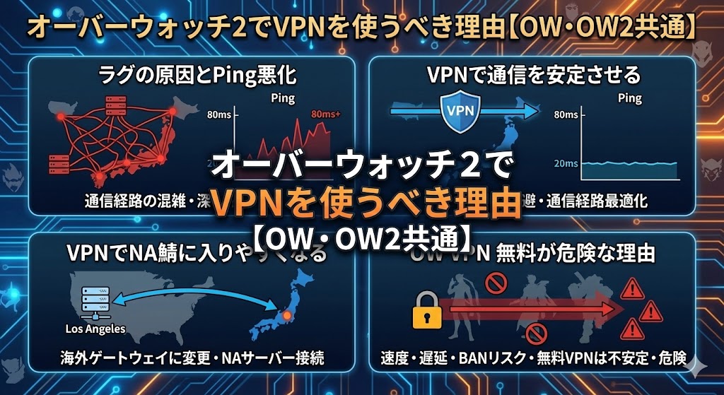 オーバーウォッチ2は時間帯によってPingが大きく変動し、特に深夜の日本サーバーは遅延やマッチの荒れが起こりやすいのが特徴です。「ラグを減らしたい」「NA鯖で遊びたい」と悩む初心者〜中級者のために、本記事ではVPNの必要性、ExitLagとの違い、最適なVPN、使い方、安全性までまとめて解説します。